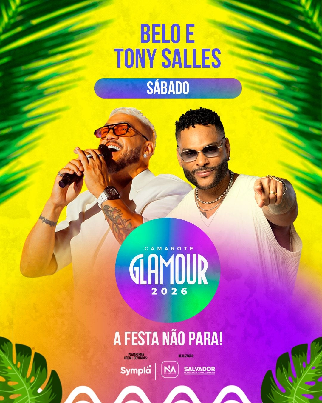 O molejo de Tony Salles vai invadir e incendiar o palco do Glamour! Ao som dos maiores hits de sua carreira, o artista promete não deixar ninguém parado com seu repertório que contém sucessos como ‘Abaixa Que É Tiro’, ‘Diferenciada’, ‘Perna Bamba’ e outros hits. E o toque de romantismo na noite de sábado ficará por conta do cantor Belo, que trará para o palco do camarote músicas que marcaram sua trajetória e foram a trilha sonora de muitas histórias de amor. Canções como ‘Perfume’, ‘Me Espera’, ‘Razão da Minha Vida’, ‘Reinventar’, ‘Ainda Gosto de Você’ e outros sucessos vão embalar o público.