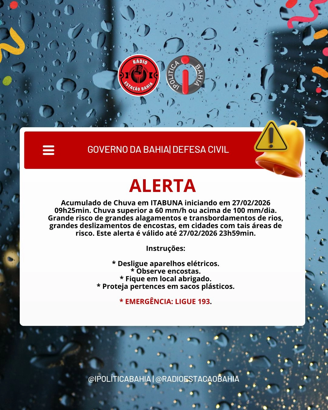 O Governo da Bahia, por meio da Defesa Civil, emitiu um alerta para a ocorrência de chuvas intensas no município de Itabuna. O aviso teve início às 9h25 desta quinta-feira, 27 de fevereiro de 2026, e segue válido até as 23h59 do mesmo dia.